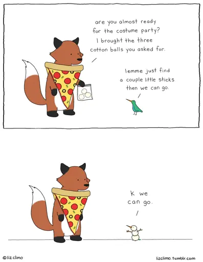 Fox and Bird are going to a costume party. Bird asked Fox to bring over three cotton balls. Fox is wondering why Bird isn’t ready to go yet, but after putting the three cotton balls on its body, Bird is now dressed as a teeny-tiny little snowman!