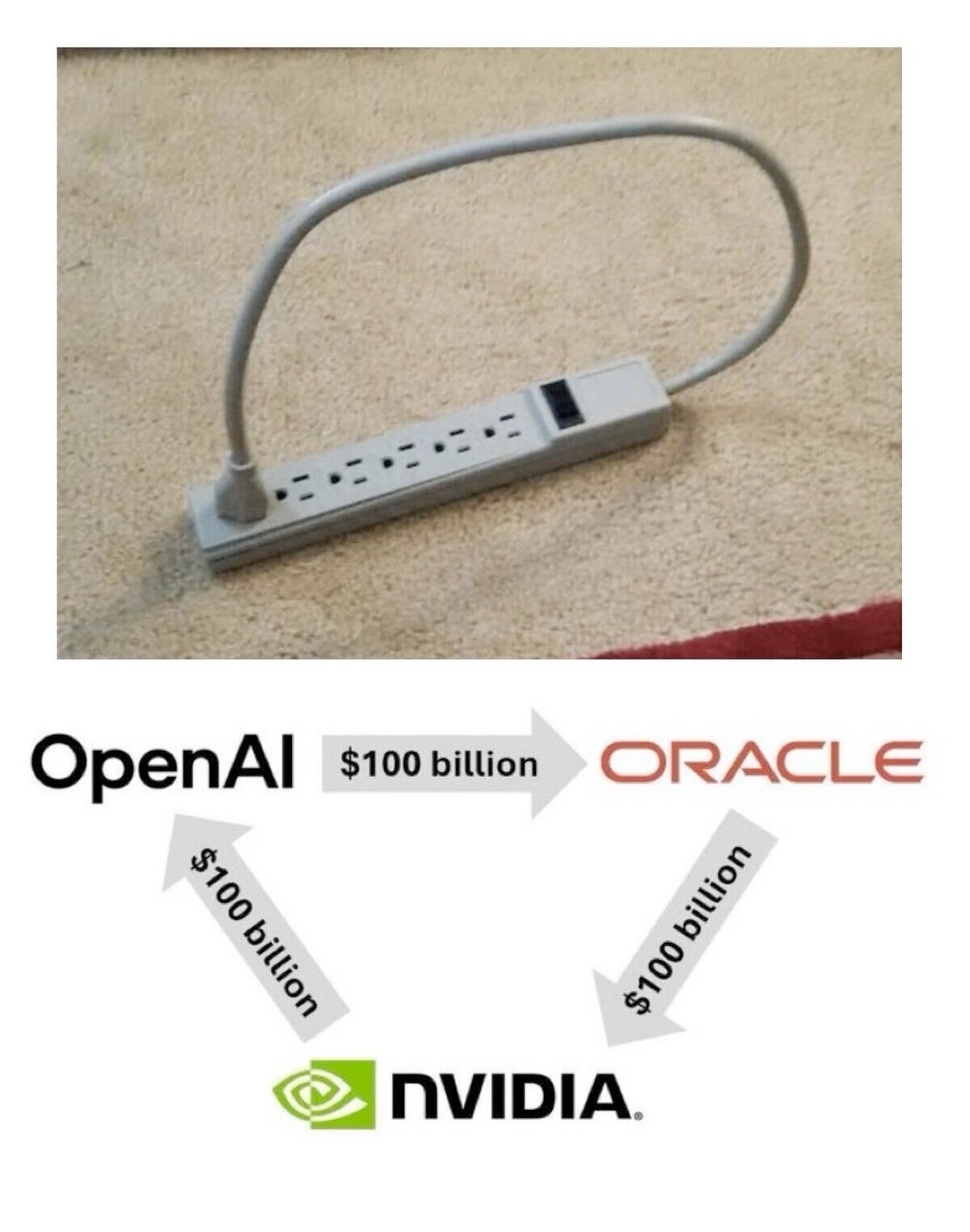 So now we have an incredibly large cyclic corporate dependency of money from Nvidia -> OpenAI -> Oracle, then back to Nvidia. Definitely not a financial disaster waiting to happen