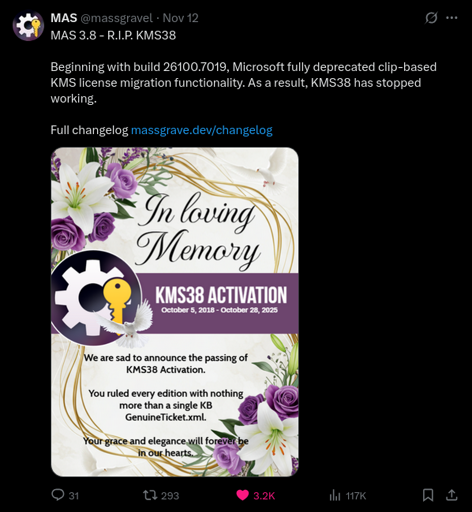 arrow-up1404arrow-down1imageMicrosoft has blocked Massgrave's KMS38 activation method for Windowslemmy.mlmr_MADAFAKA@lemmy.ml to Piracy: ꜱᴀɪʟ ᴛʜᴇ ʜɪɢʜ ꜱᴇᴀꜱ@lemmy.dbzer0.comEnglish · 20 days agomessage-square135linkfedilinkfile-text