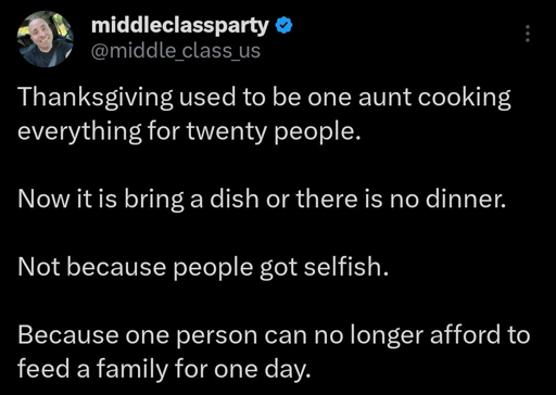 Middle class is gone. You’re either extremely rich, or you’re down in the dirt with us poors.