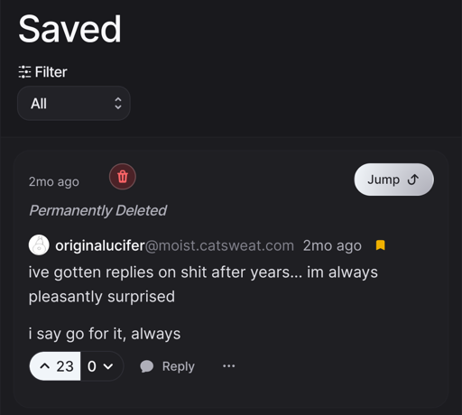 minus-squareMark with a Z@suppo.fiOPlinkfedilinkarrow-up2arrow-down1·edit-22 days agoI saved that comment for a year or so from now. The post is deleted.