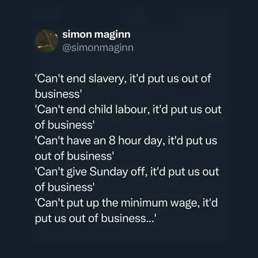 Fuck your business. If it’s not even equitable to live, get fucked, social contract broken, and I will just take whatever I need from you by force. I’m not gonna lay down and die because of your fucking profit margin.