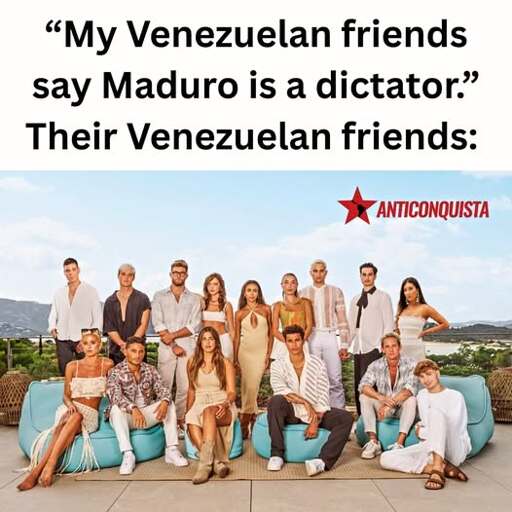 I know most of accounts in some instances automatically will upvote anything that goes with their PV and downvote the opposite (i.e. .ml and the meme in this post). It’s disappointing that for years the up/downvote rhetoric has been for what really adds to the conversation and I find this reply more according to the reality from the PV of someone that is not Venezuelan but has roots and friends there but most importantly that we’re not part of the meme, just average people that don’t wish for anyone what means to live there as the average or below. I do remember when I was a child and had the joy of go to Venezuela and to have fun on vacations, now I it’s not joy but the feeling of accomplish humanitarian labor and donations to average and poor Venezuelans that at first supported the socialism that Chávez sold them and later Maduro, Cabello and others continue in a nonsense of left political system. If someone downvote replies citing sources from the Venezuelan diaspora, let me remind you that that diaspora is not 100% from the people of this post meme but real Venezuelans that have left/lost almost everything because of really bad politics and actions of Chávez, Maduro and others that surprise: the last presidential election didn’t got official acts published.