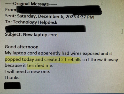 Reported it to IT who came and visually looked at it and said yeah it looks fine to us, computer turns on, bye