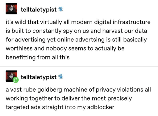 I showed my sister ad block and she was like why would i want to block ads. She said she has her algo dialed in and the ads just show her products she probably wants to buy.