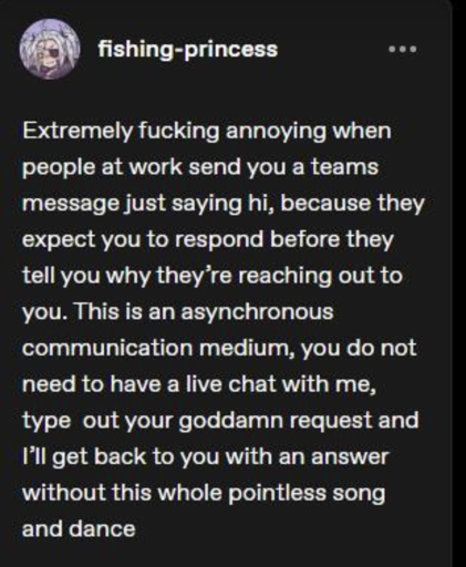 minus-squaredumples@piefed.sociallinkfedilinkEnglisharrow-up11·10 days agoWe had a communication training at my work that told us to always start with a Hi before asking the question on teams. It was infuriating