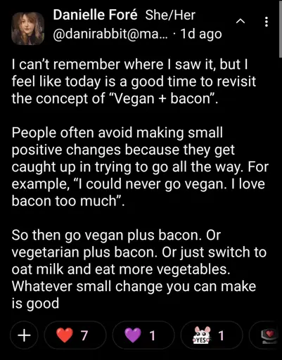 I would argue that the person willing to give up 95% of their meat consumption cares more about making a change than the one telling them not to bother at all because it’s not the full 100%.