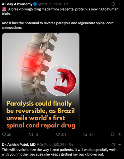 The drug is Polyaminin and has been hyped by one group for 20 years, mostly on animal models and they still have yet to complete a proper clinical trial.