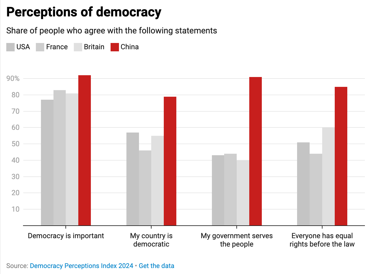 I’ve seen this picture used in some pro-China instances, I don’t think it’s a useful statistic in a slightest. It can just as well show how indoctrinated people are in China (and it in fact does by looking at a second graph, it’s comical to claim that China is a democracy)